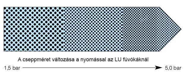 - a fúvóka méretétől és az üzemi nyomástól függően apró, közepes és durva cseppekre történő porlasztás